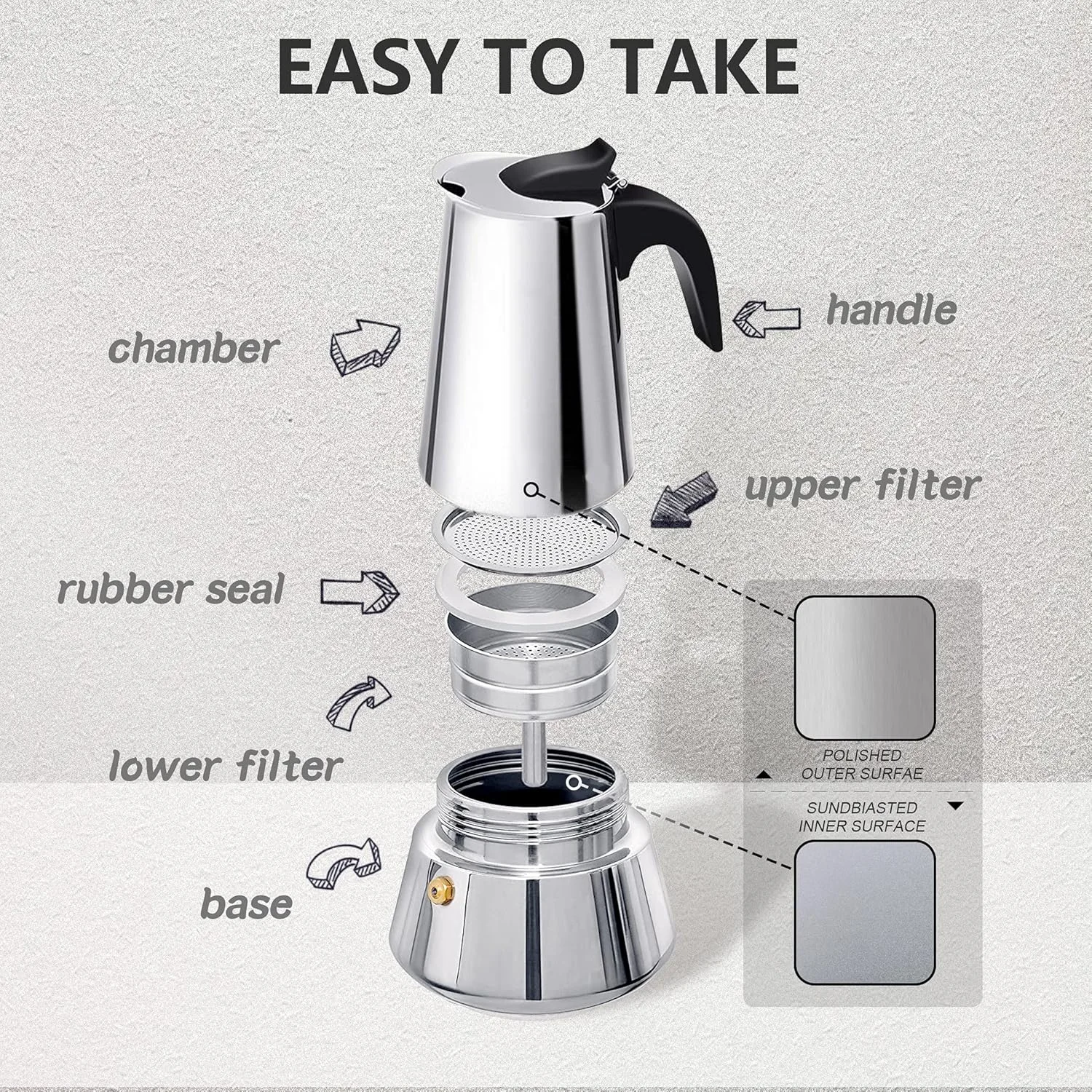 - ☕ ستانلس ستيل عالي الجودة: مصنوع من الستانلس ستيل الآمن غذائيًا والذي يتميز بمقاومة قوية للتآكل والصدأ، ويتميز بعمر افتراضي فائق بالمقارنة مع تصميمات الألومنيوم. سدادات عالية الجودة وسلة / فلتر فولاذي. صمام تخفيف الضغط الآمن المدمج من أجل سلامتك لضمان عدم حدوث الضغط الزائد، مما يجعل القهوة أكثر نعومة، تجلب لك قهوة عالية الجودة لتستمتع بها.